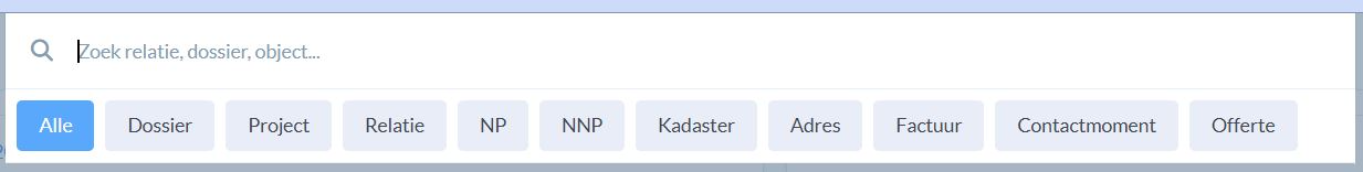 Om een relatie of een object snel te vinden in Nobilex kan je gebruik maken van de grote zoekbalk bovenin. Of je gaat naar de betreffende tegel aan de linkerkant waar je in wilt zoeken, zoals Relaties.