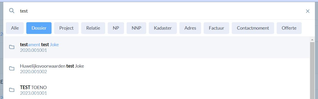 Ben je het dossiernummer vergeten, dan kan het zoeken op de titel of het label er ook voor zorgen dat het dossier naar voren komt.