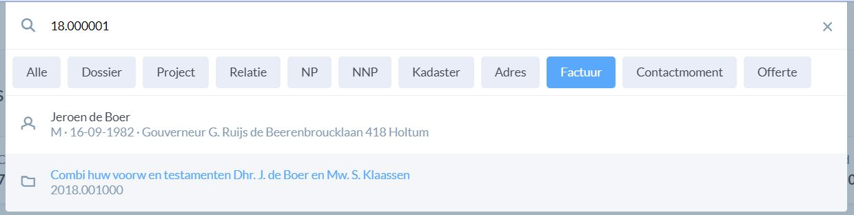 Gebruik de filter factuur en het nummer om een factuur op te zoeken. Hier komen ook de relaties/dossiers naar voren waar de factuur aan gekoppeld is.