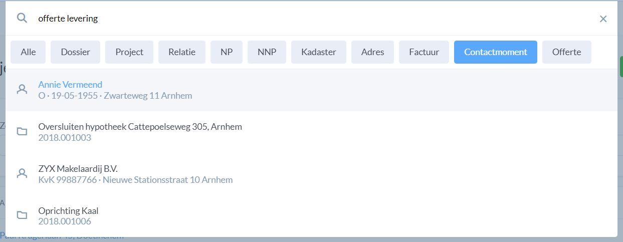 Om een contactmoment te vinden in Nobilex, klik je in de algemene zoekbalk de filter Contactmomenten aan en typ je het onderwerp in.