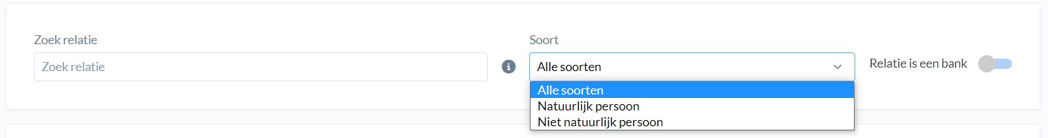 Ook bij de tegel Relaties kan je gebruik maken van filters om nauwkeuriger te zoeken. Hier kan je bijvoorbeeld aangeven of het om een bank gaat, zodat het systeem alleen kaarten van banken naar voren haalt.