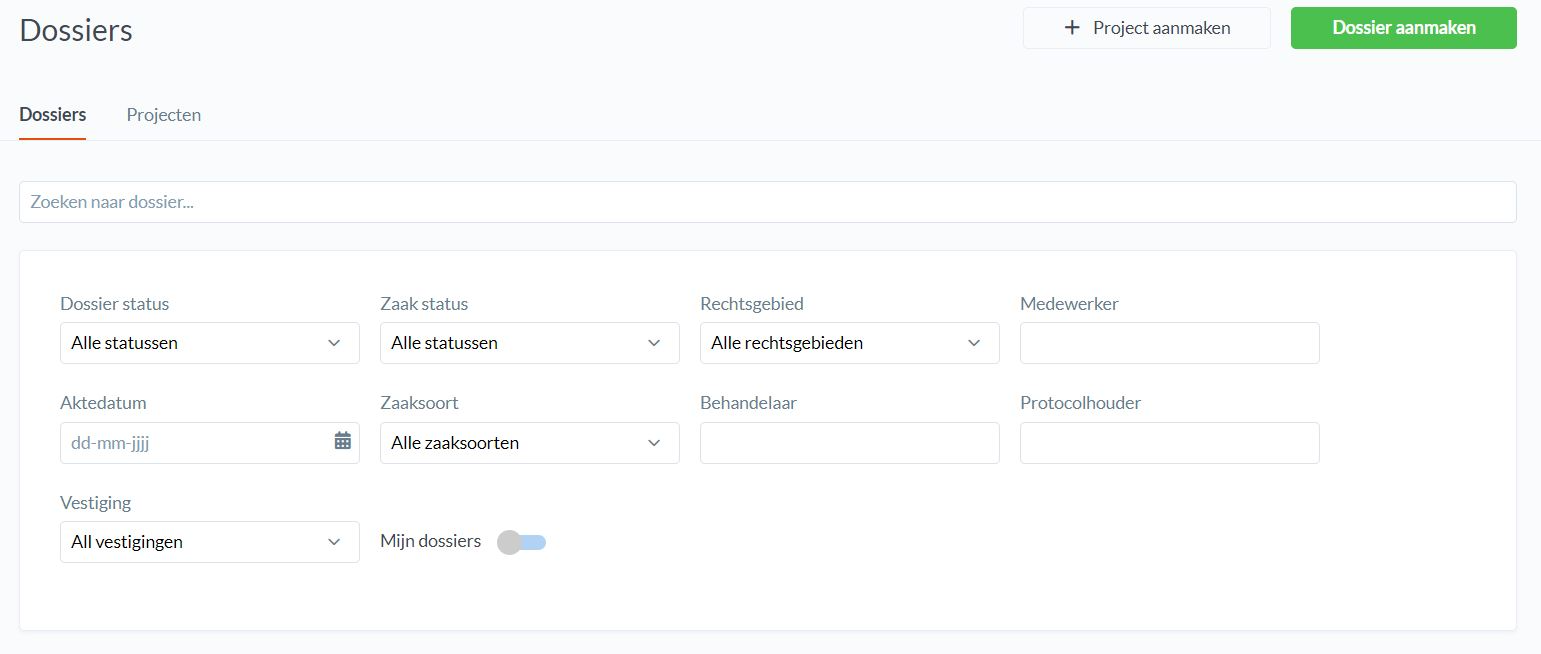 Om geavanceerd naar een dossier te zoeken, ga je links naar de tegel Dossier. Hier zijn verschillende filters beschikbaar om heel nauwkeurig een dossier naar voren te halen. Door bijvoorbeeld op rechtsgebied te selecteren of het schuifje "Mijn dossiers'" aan te zetten.