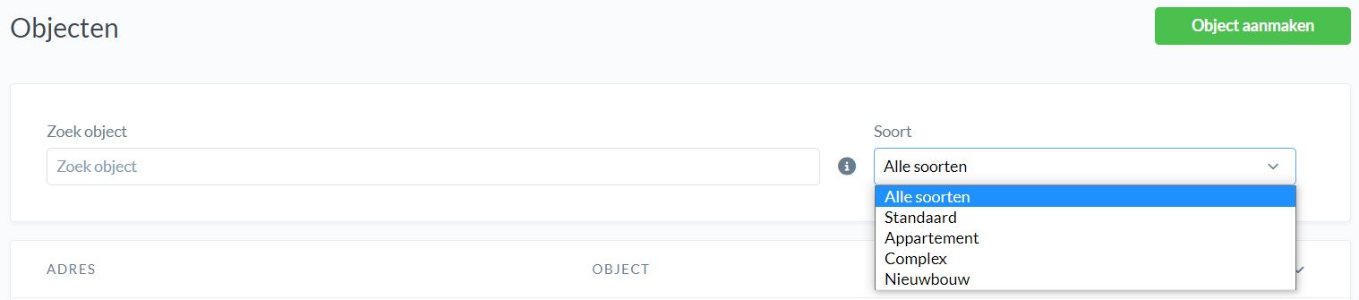 Om te zoeken op een object kan je in de algemene zoekbalk een postcode invoeren met het huisnummer. Links bij de tegel Objecten kan je nauwkeuriger zoeken door gebruik te maken van de filters. Door bijvoorbeeld op soort te filteren.