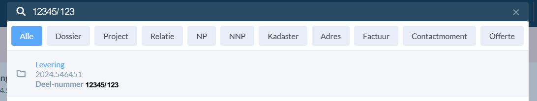 Zodra het deel en nummer is binnengekomen op de zaak, of handmatig is ingevuld, kan je deze terugvinden door het op de volgende manier in de zoekbalk te typen: 12345/123