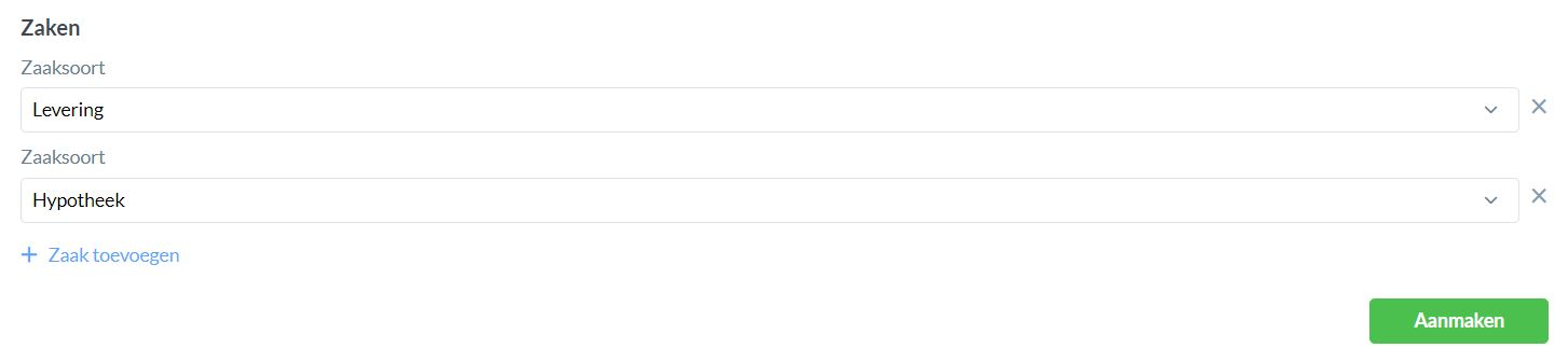 Door in kantoorbeheer handige combinaties aan te maken kunnen dossiers snel worden aangemaakt. Het is altijd mogelijk om in specifieke situaties bij het aanmaken van het dossier een extra zaak toe te voegen of om later zaken toe te voegen.