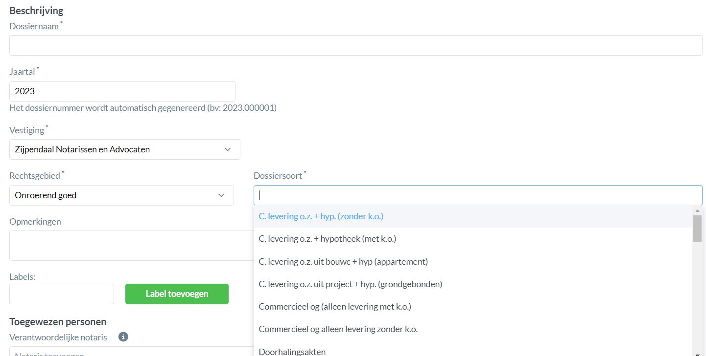 Bij het aanmaken van een dossier kies je een rechtsgebied en een dossiersoort. Deze bevat een vooraf gedefinieerde set aan zaaksoorten.