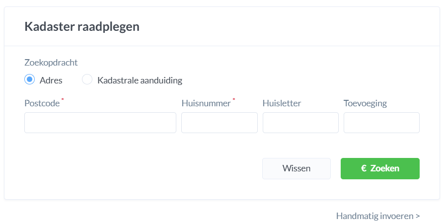 - Raadplegen van het Kadaster: Voeg het object toe op basis van gegevens uit het Kadaster. Er zal meteen een inzage uitgevoerd worden op het object (let op, hier zijn kosten aan verbonden).