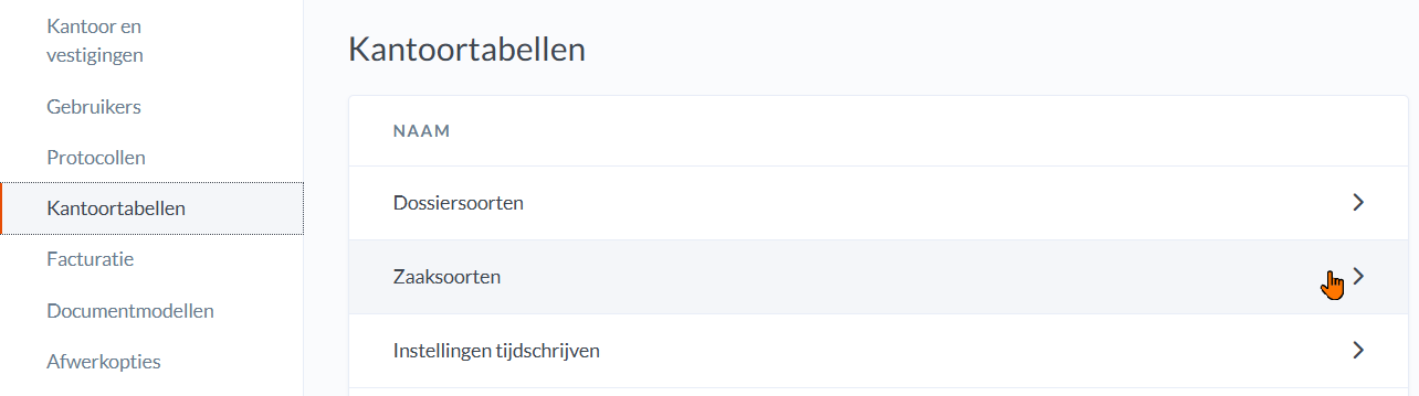 In Kantoorbeheer ga je naar kantoortabellen en zaaksoorten.