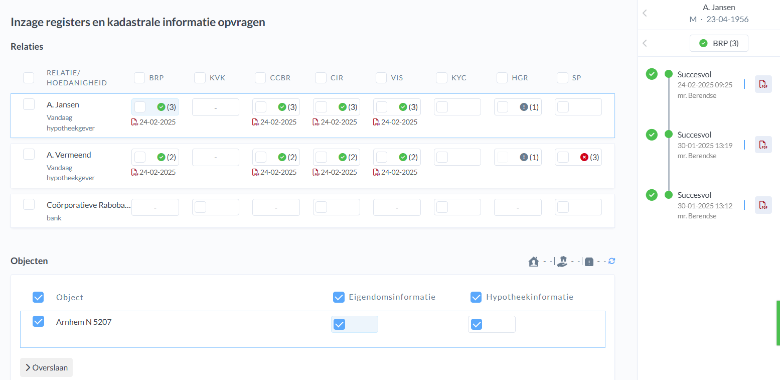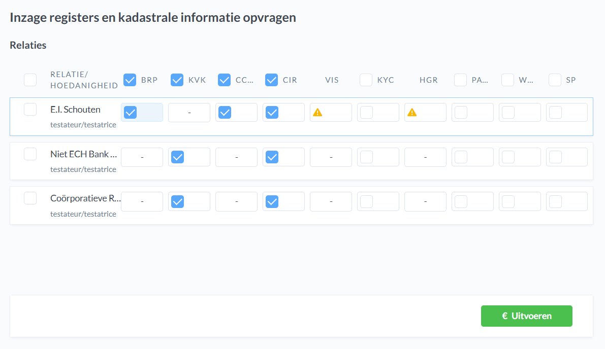 Vervolgens zie je alle partijen staan die gekoppeld zijn in het dossier. Via de vinkjes kan je aangeven bij wie je inzages wil doen en welke variant. Klik op uitvoeren zodra je alles hebt aangevinkt dat je wil laten rechercheren.