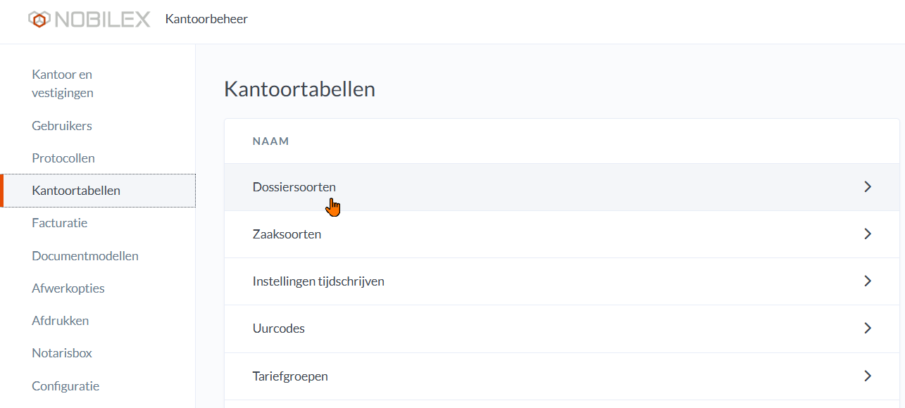 Klik op Kantoortabellen en vervolgens op Dossiersoorten.