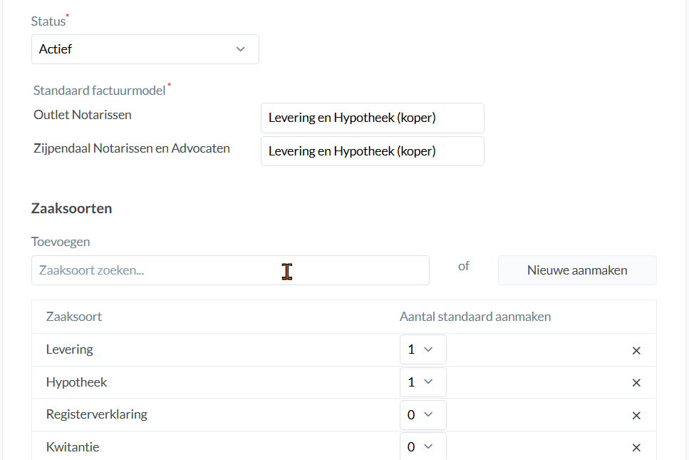 Scrol naar beneden tot je bij het kopje Zaaksoorten komt. Typ vervolgens het zaaksoort in dat je zoekt en sla je wijzigingen daarna op. Lees hier (artikel zaaksoort aanmaken) hoe je een nieuw zaaksoort aanmaakt.