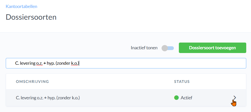 Zodra je je dossiersoort heb gevonden, klik je op het pijltje rechts achter de naam om je dossiersoort te openen en te bewerken.