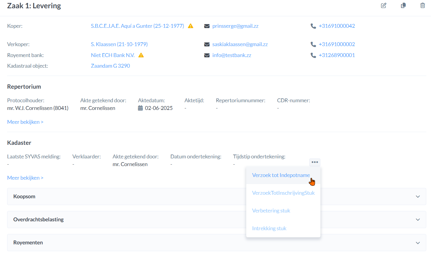 - Voor andere zaaksoorten moet het depotnummer handmatig worden overgenomen uit de PDF die je terugkrijgt van het Kadaster en worden ingevuld in de zaak.