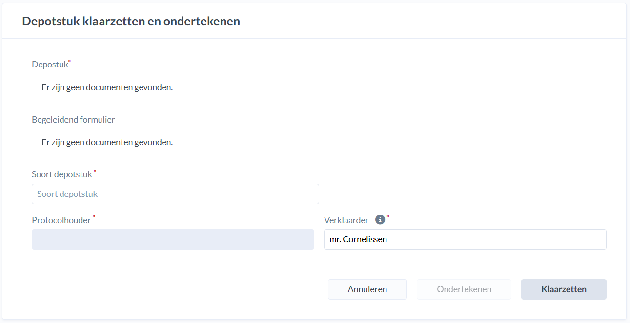 Staat je depotnummer in de zaak ingevuld? Dan hoef je dit niet nogmaals bij het klaarzetten en versturen in te vullen. Dit wordt dan in de metadata meegegeven naar het Kadaster.