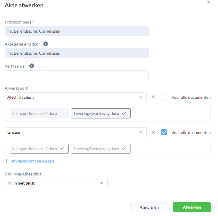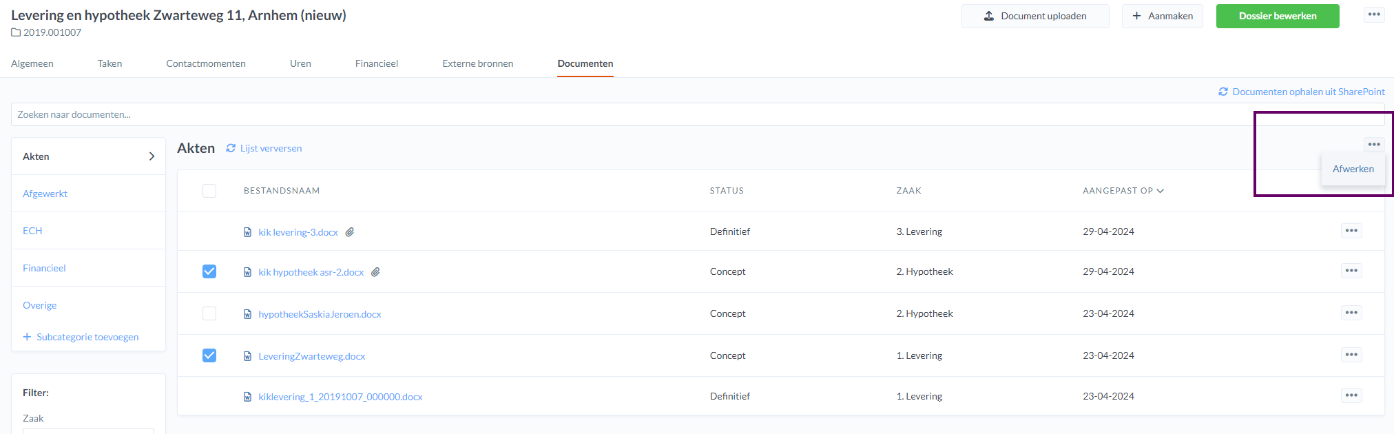 Het is mogelijk om in een dossier meerdere akten tegelijkertijd af te werken. Selecteer op het tabblad 'Documenten' in een dossier de akten die je wilt afwerken en klik op 'Afwerken' bij de 3 puntjes rechts bovenin.
