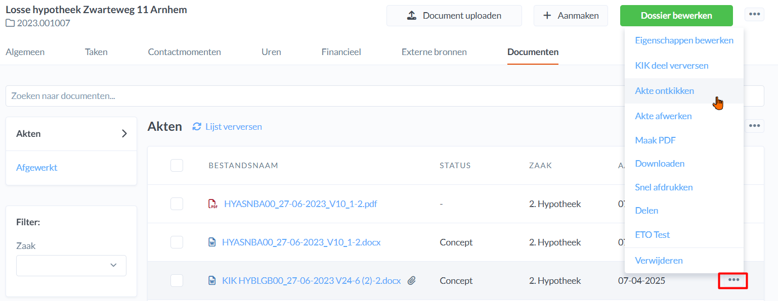 Om een KIK akte te ontkikken klik je op de drie puntjes achter het document: