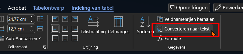Vervolgens zie je bovenin je Word lint Indeling van tabel staan. Kies de optie Converteren naar tekst.