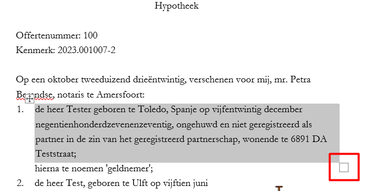 Open de ontkikte akte in Word. Selecteer de tabel van de comparitie door dubbel te klikken op het vierkantje dat rechtsonder een alinea zichtbaar is.
