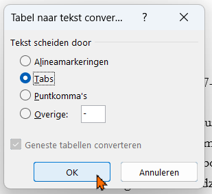 Om de comparitie te kunnen bewerken, kan je de tabellen converteren naar tekst. Dit gaat in Word als volgt: