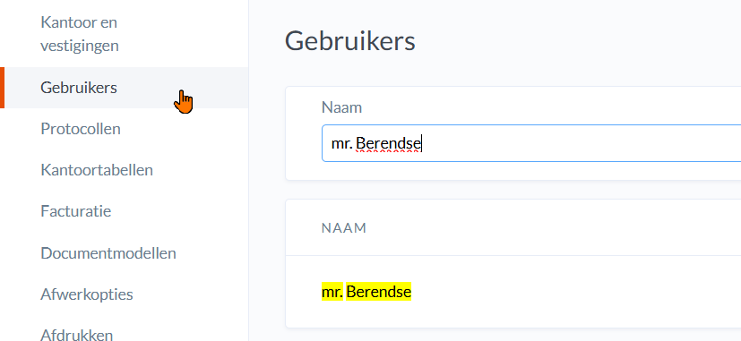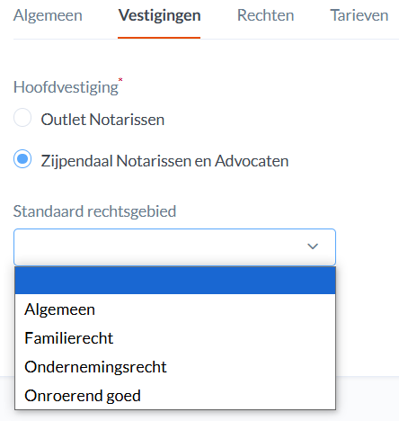 Het tweede tabblad gaat over het instellen van de vestiging. Met name voor kantoren met meerdere vestigingen is dit stukje relevant. Mocht een medewerker een standaard rechtsgebied hebben, dan kan dit in het drop-down menu geselecteerd worden.
