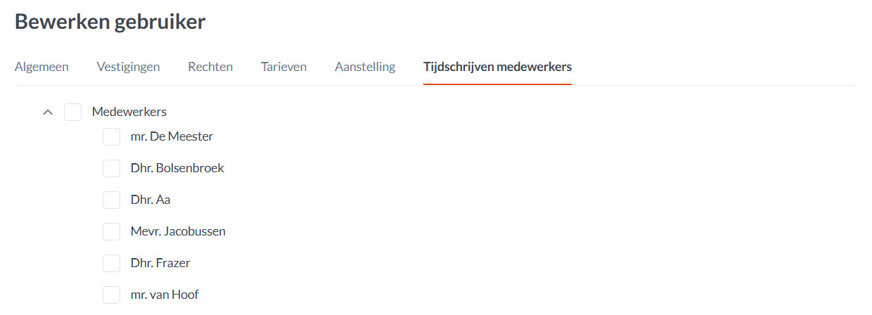 In het tabblad zelf selecteer je voor welke medewerkers je tijd schrijft.