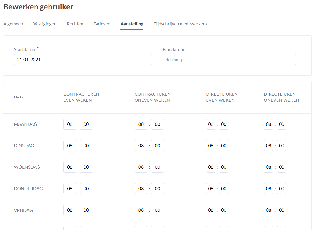 In de Aanstelling vul je in hoeveel uren je normaal gesproken werkt volgens je contract. Dit helpt om een duidelijk overzicht te krijgen van je werkuren.