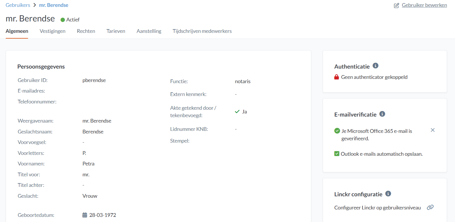 In het algemene tabblad vind je gegevens zoals het gebruiker ID, e-mail adres, geslachtsnaam, etc. Maar ook de notarisverklaring, stempel, lidnummer KNB en handtekening. Om de gegevens te bewerken klik je rechtsboven op 'gebruiker bewerken'