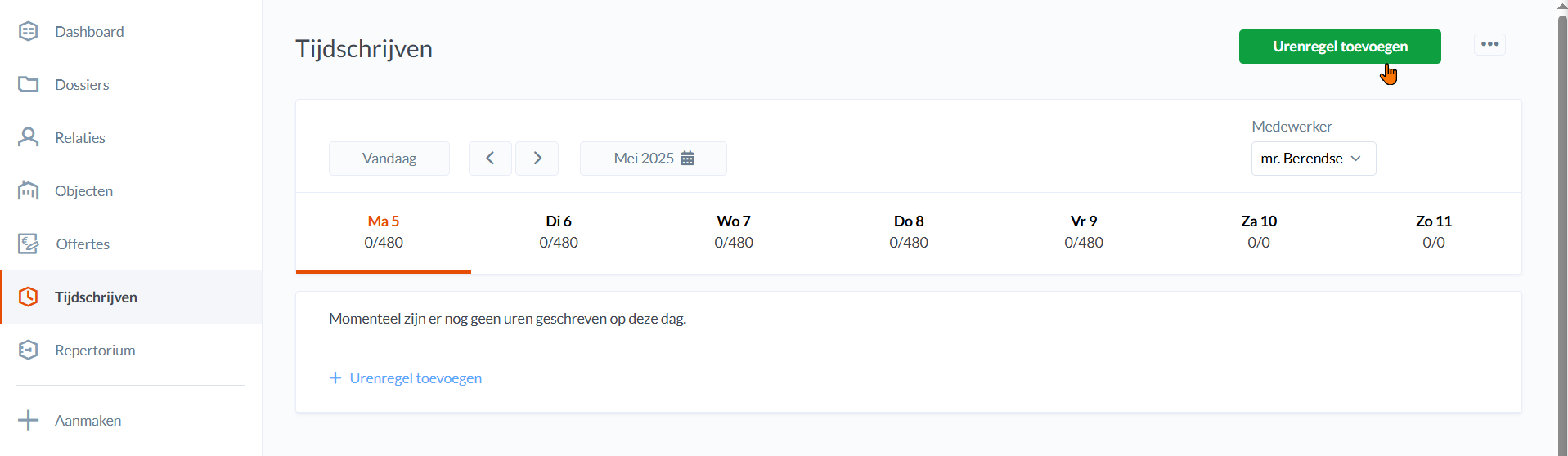 In Notarisportaal klik je vervolgens op het tabje Tijdschrijven. In het dropdown menu Medewerker kan je de medewerkers selecteren waar je de rechten voor hebt aangezet in je account. Dit kan je ook doen via de optie urenregel toevoegen.