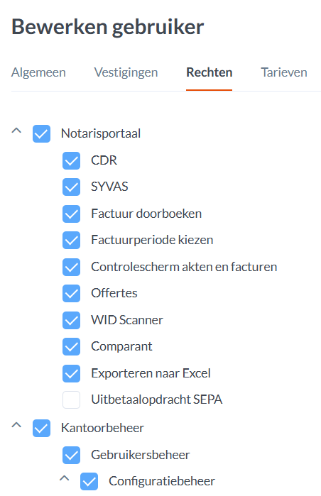 Bijvoorbeeld, je kunt ervoor kiezen om bepaalde gebruikers geen toegang te geven tot specifieke functies, zoals Kantoorbeheer. Zo kun je de toegang beperken tot alleen de onderdelen die relevant zijn voor die gebruikers.