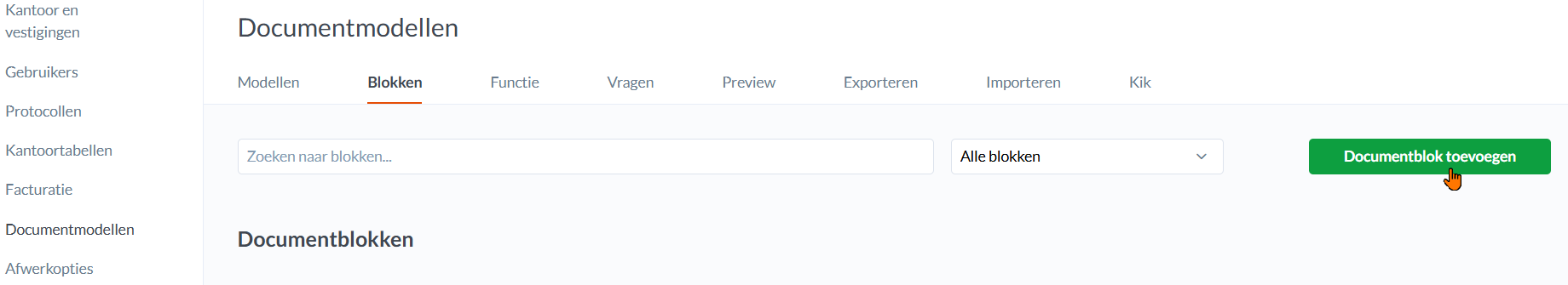 Ga daarna naar Kantoorbeheer ➡️ Documentmodellen ➡️ Blokken en selecteer ‘documentblok toevoegen’. Geef het blok een logische naam (bijv “aanhef Email”)