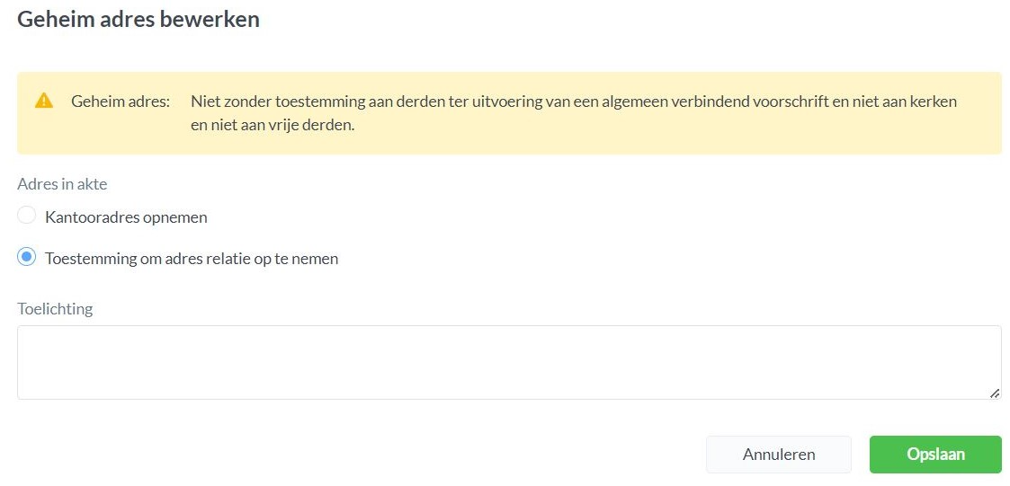 Nobilex heeft er bewust voor gekozen om toestemming te vragen aan het kantoor voordat geheime adressen verwerkt kunnen worden. Dit omdat er situaties kunnen zijn waarbij voorzichtig te werk gegaan moet worden bij het verwerken van geheime adressen.