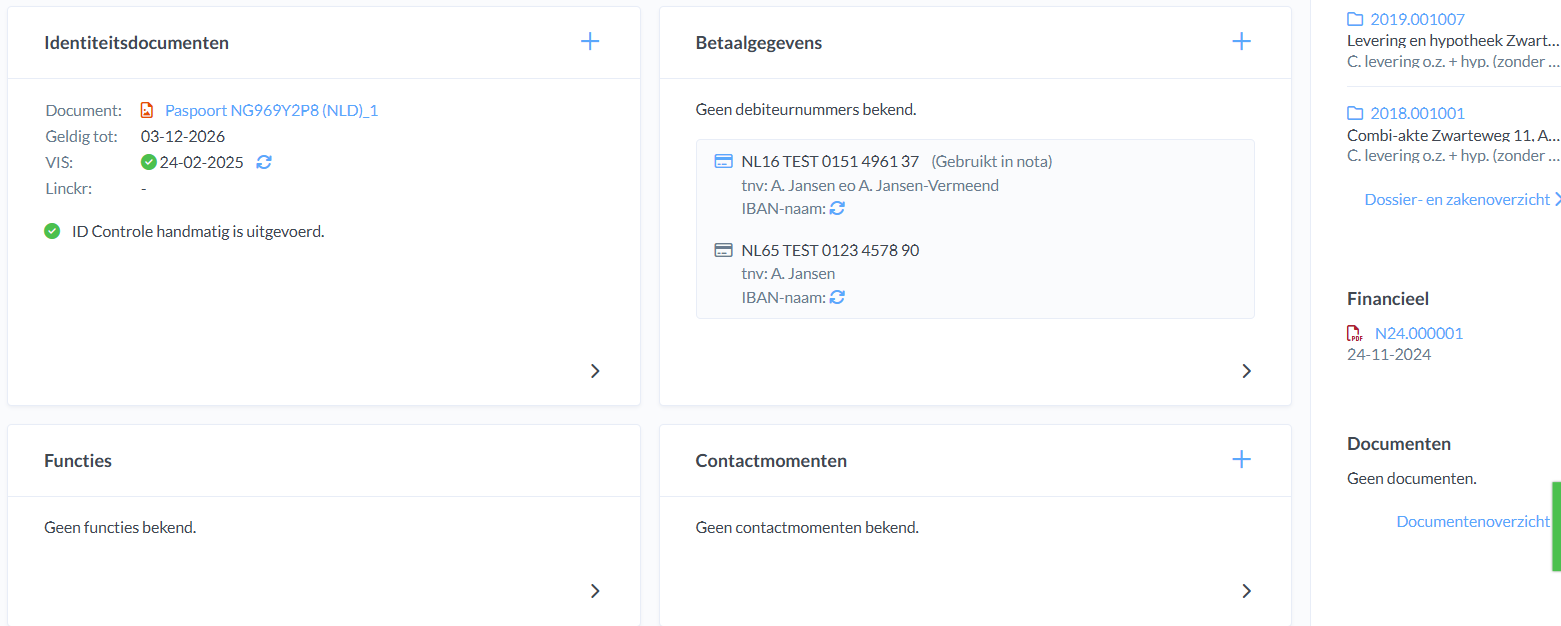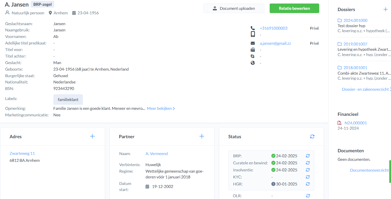 In de relatiekaart vind je alle bijbehorende gegevens zoals het adres, partner, status, identiteitsdocumenten, betaalgegevens, functies en afgesproken contactmomenten. Om een kaart te bewerken klik je op de groene knop 'Relatie bewerken'. Dit geldt ook voor NNP relatiekaarten.