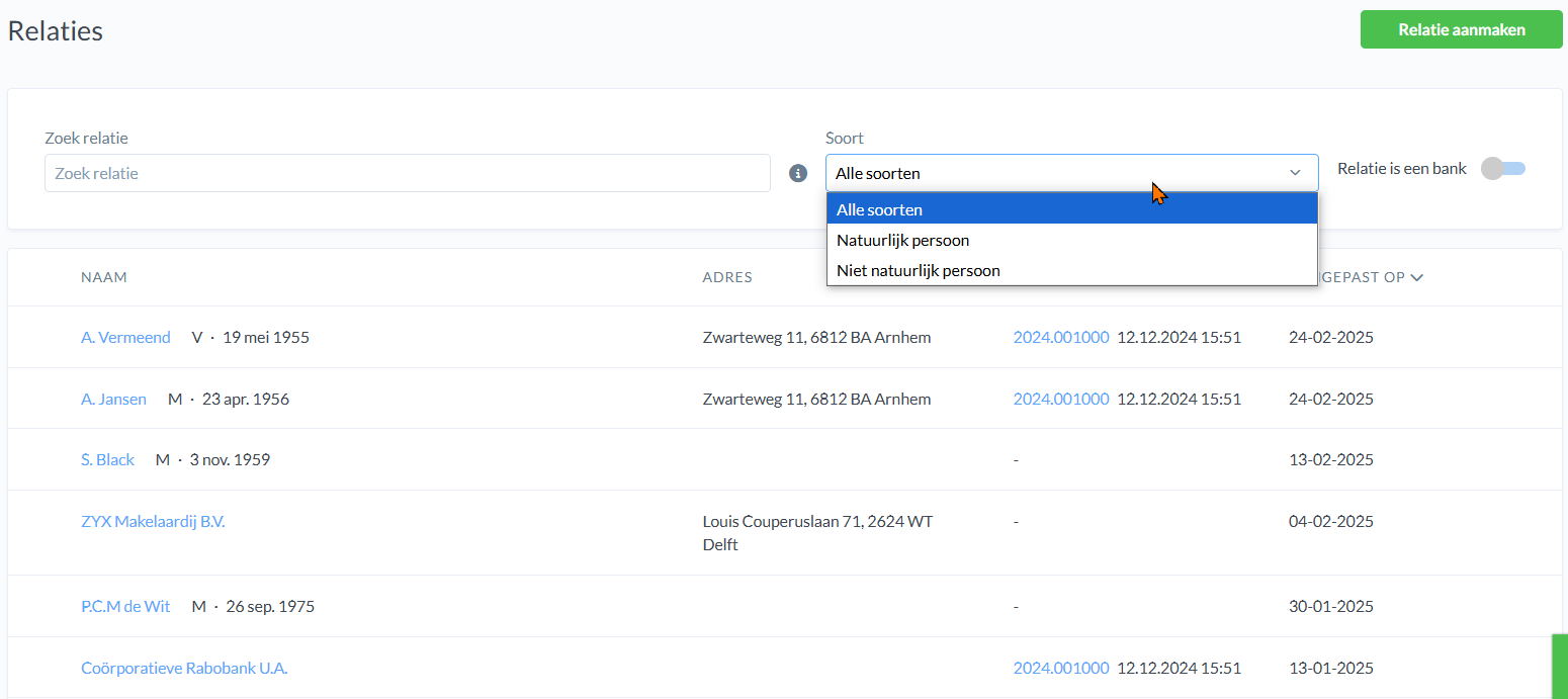 Hier vind je alle bestaande relaties in je systeem, zowel natuurlijke personen als niet-natuurlijke personen. Onder 'soort' kan je filteren op een natuurlijk persoon of een niet-natuurlijk persoon. Klik op een bestaande relatie om de kaart te bekijken.