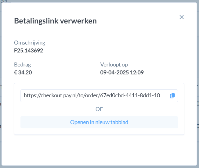 Nadat je op de knop 'Betalingslink verwerken' hebt geklikt, verschijnt er een pop-up met de omschrijving van de factuur, het bedrag, de termijn en de betalingslink zelf. Je kunt de link kopiƫren via het kopieerknopje of deze openen in een nieuw tabblad. Vervolgens stuur je de link naar de klant.