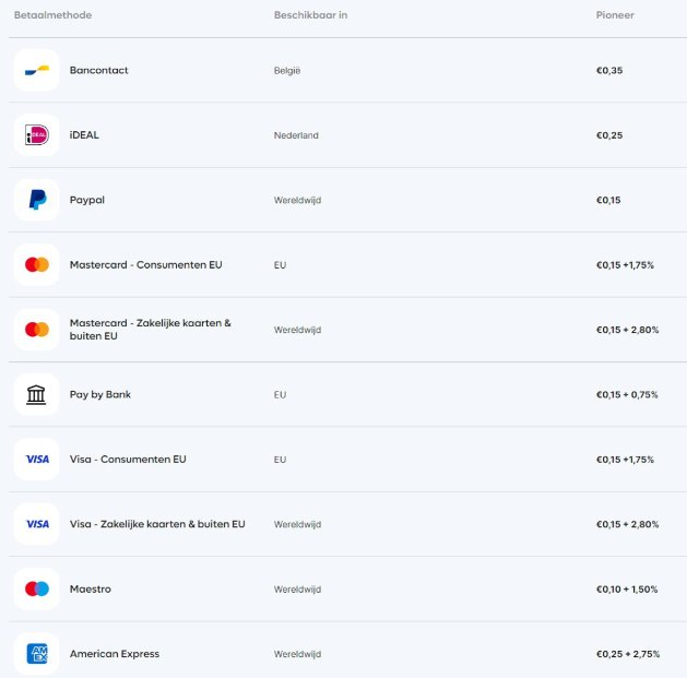 De tarieven die van toepassing zijn bij transacties met Pay.nl. De tarieven zijn per betaling/transactie. Pay ondersteund nog veel meer betaalmethodes, deze vind je terug op de website.