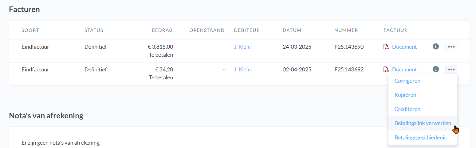 Wanneer de koppeling met Pay live is, kun je bij de factuur in je dossier op de drie puntjes klikken om de optie 'Betalingslink verwerken' te zien. Deze optie is pas zichtbaar nadat de factuur is goedgekeurd (dus niet in de status concept).