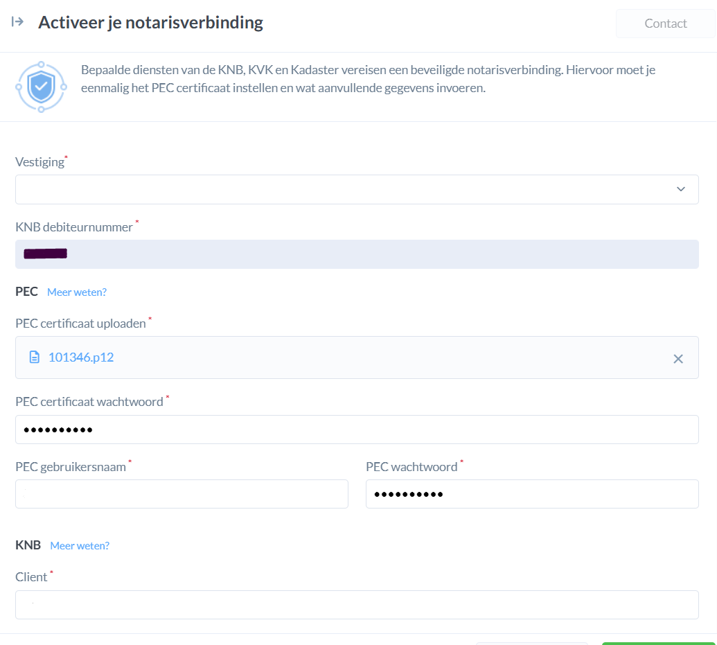 Staat er "KVK (KOS) is niet gekoppeld. PEC is gekoppeld? Dan moeten de gegevens bij het kopje KNB nog ingevuld worden, in het 'Activeer je notarisverbinding' scherm.