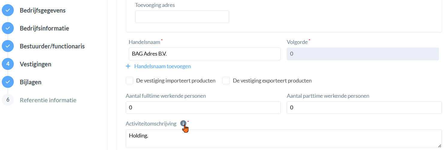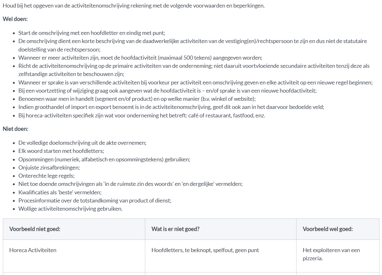 Onder het i'tje vind je alle do's en don't terug over de activiteitomschrijving. De KVK stelt hier een aantal eisen.