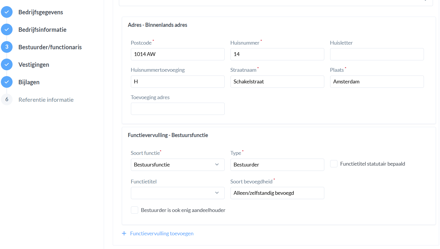 In het derde scherm worden de gegevens van de bestuurder uit de zaak opgehaald. Je dient nog wel handmatig het veld van de functievervulling/bestuurdersfunctie aan te vullen. Klik vervolgens weer op opslaan en doorgaan.