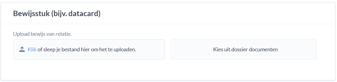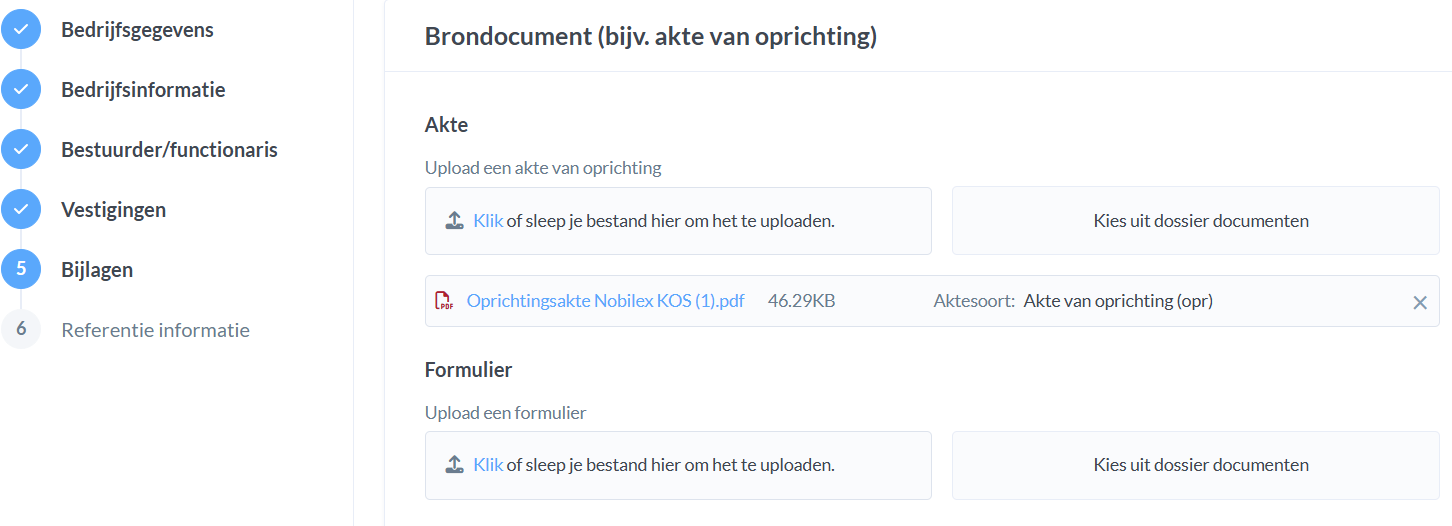 In het vijfde scherm kun je de akte, een formulier en een datacard uploaden. Wanneer de akte al in je dossier staat, kies je voor de optie 'Kies uit dossier documenten'. Dit is geen verplichting, je kan ook het document vanaf je bureaublad of je Downloads uploaden. Selecteer daarbij een passend aktesoort.