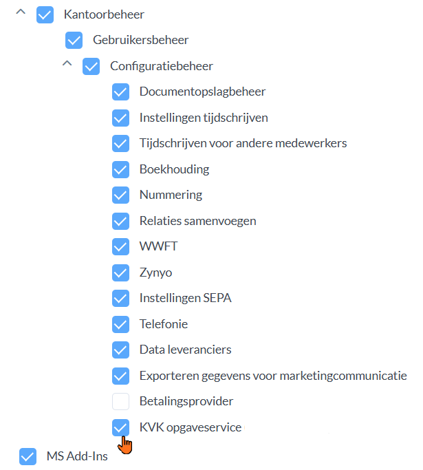 Ben jij degene die de verbinding gaat maken tussen Nobilex en KOS? Dan dien je ook onder Kantoorbeheer het recht "KVK opgaveservice" te selecteren. Dit is nodig voor de configuratie.