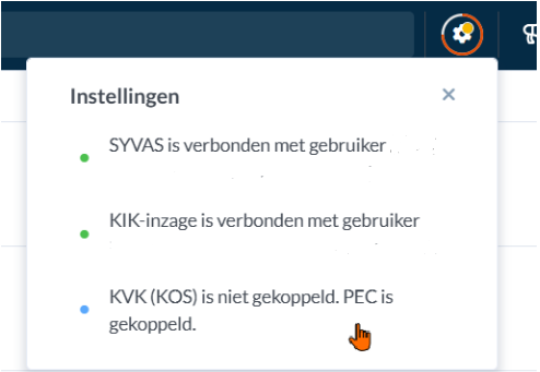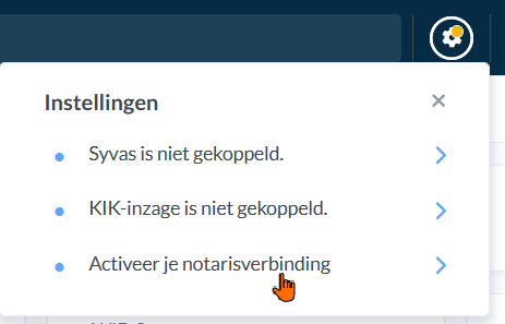 Om de KOS koppeling te verbinden, klik je op het tandwieltje en selecteer je de onderste optie 'activeer je notarisverbinding':