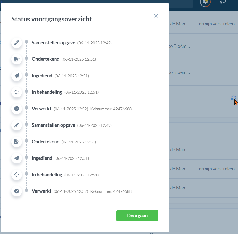 Bij de taak KVK Opgave valideren en indienen kun je zien wat de status is. Klik rechts op het blauwe pijltje om een uitgebreid overzicht te zien. Zodra het verwerkt is wordt automatisch het KVK nummer op de kaart van de relatie genoteerd.