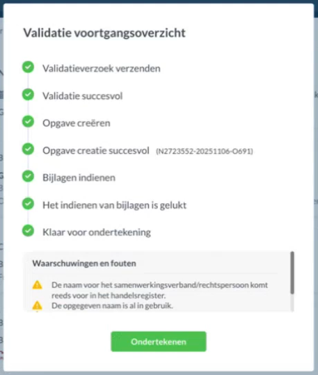 Nadat je op verzenden hebt geklikt worden de gegevens gevalideerd bij de KVK. Ontbreekt er nog iets of is er ergens aandacht vereist, dan zal hiervan een melding komen. Klik vervolgens op Ondertekenen om naar de taak te gaan.