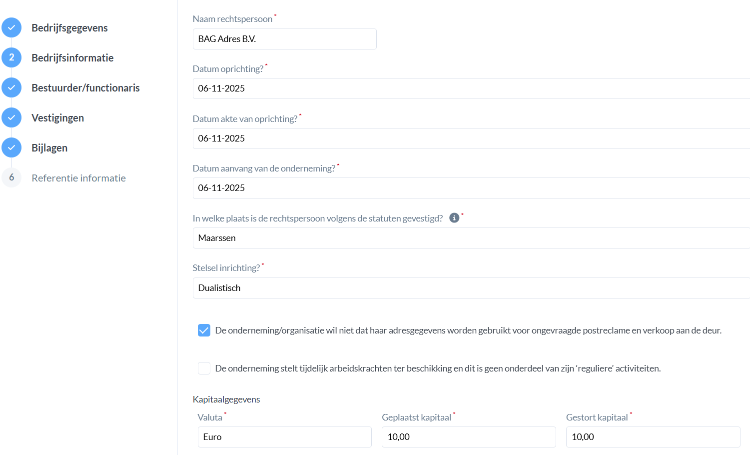 Wanneer de adresgegevens in de relatiekaart van de op te richten rechtspersoon staan ingevuld, zal dit vooraf worden ingevuld.