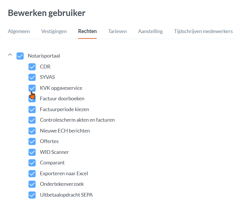 Dit stel je in door in Kantoorbeheer naar de Gebruikers te gaan en een account te selecteren. Klik vervolgens op het tabblad Rechten en vink het recht "KVK opgaveservice" aan onder Notarisportaal.