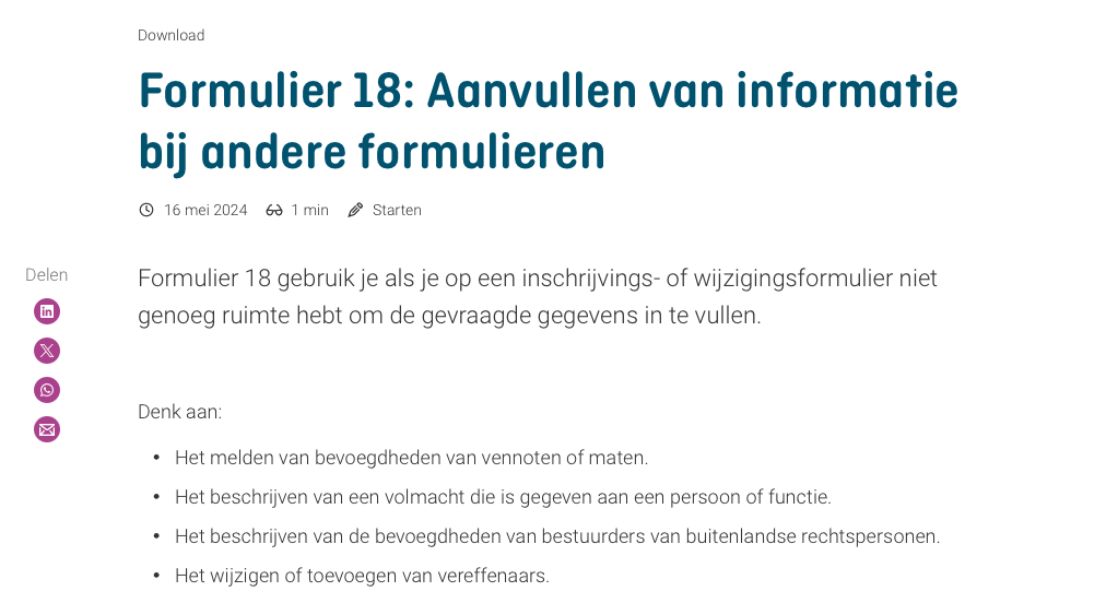 Wil je gebruik maken van deze functionaliteit? Meld dit dan bij onze servicedesk, dan brengen wij de KVK op de hoogte dat er een opgave hun kant op komt. Op dit moment is het alleen nog mogelijk een beperkte B.V. in te schrijven met 1 bestuurder.
