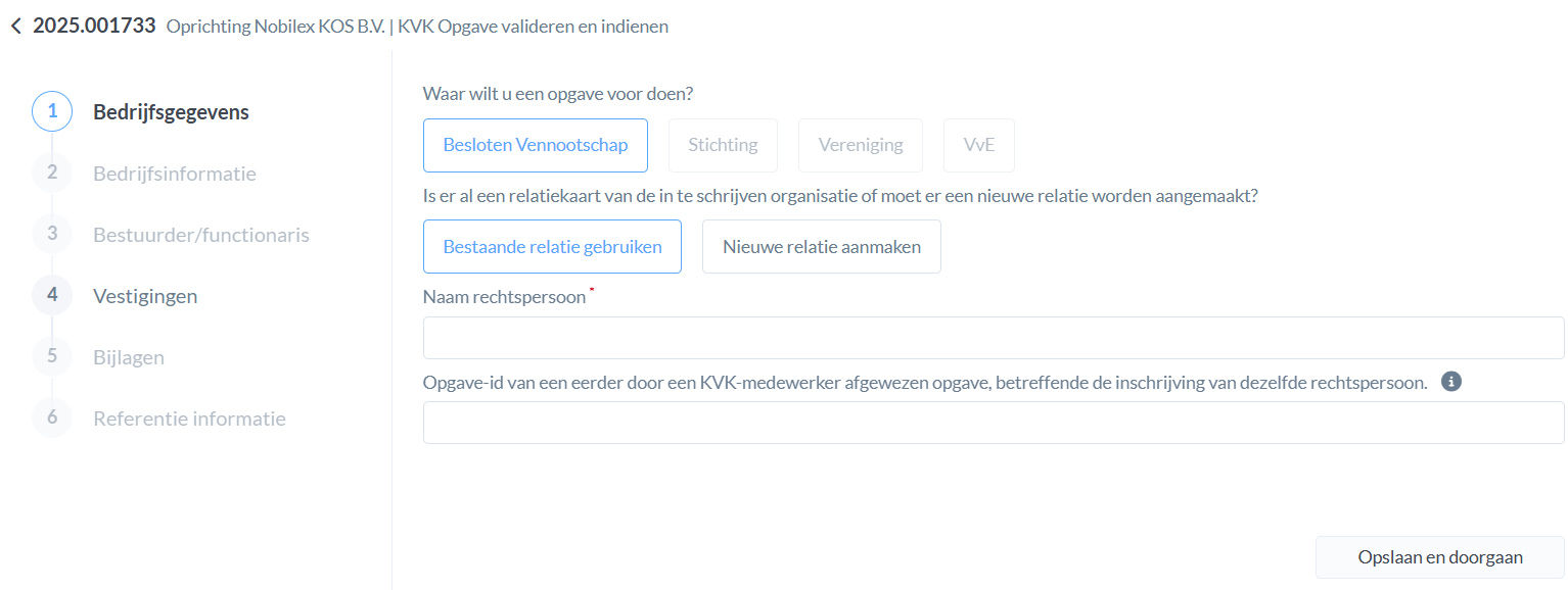 In het eerste scherm vul je in waar je een opgave voor wil doen en kan je kiezen voor een bestaande relatiekaart of voor de optie om een nieuwe relatiekaart aan te maken. Wanneer je al een relatiekaart hebt voor de rechtspersoon en deze staat gekoppeld in je zaak, zal Nobilex automatisch met de juiste suggestie komen zodra je op het veld "Naam rechtspersoon" klikt. Klik op opslaan en doorgaan zodra je alles hebt ingevuld.