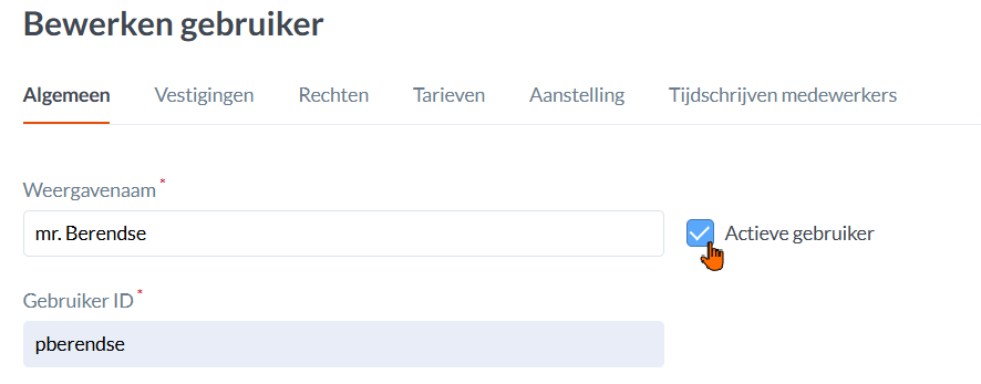 Klik het vinkje uit om de gebruiker op inactief te zetten en sla je wijzigingen op.
