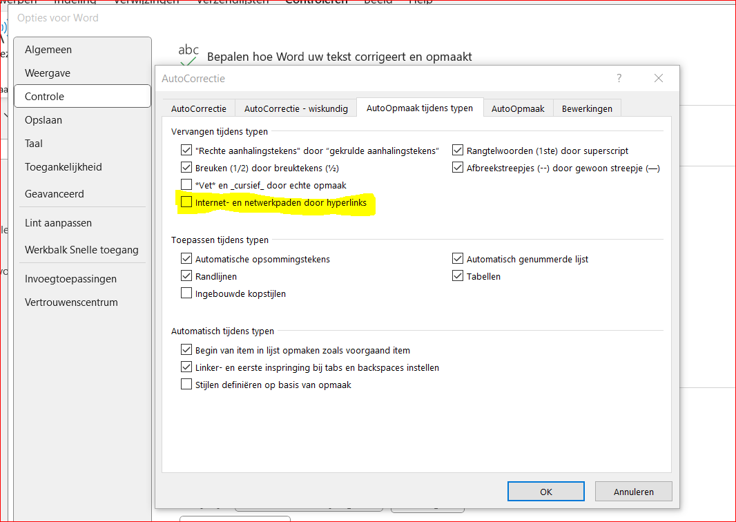 Wanneer je akte wordt afgekeurd door het Kadaster vanwege een hyperlink, controleer dan ook zeker of je profielinstelling in Word het vinkje uit heeft staan bij 'Internet- en netwerkpaden door hyperlinks'. Dit kan je terugvinden in Word door bovenin op Bestand te klikken, dan naar Opties te gaan, Autocorrecties-opties en vervolgens AutoOpmaak tijdens typen.